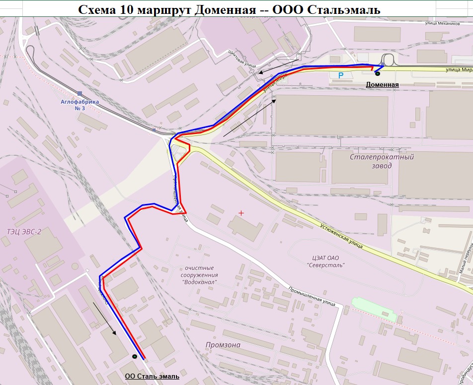 Маршрут автобуса № 10 от "Доменной" до "СтальЭмаль"